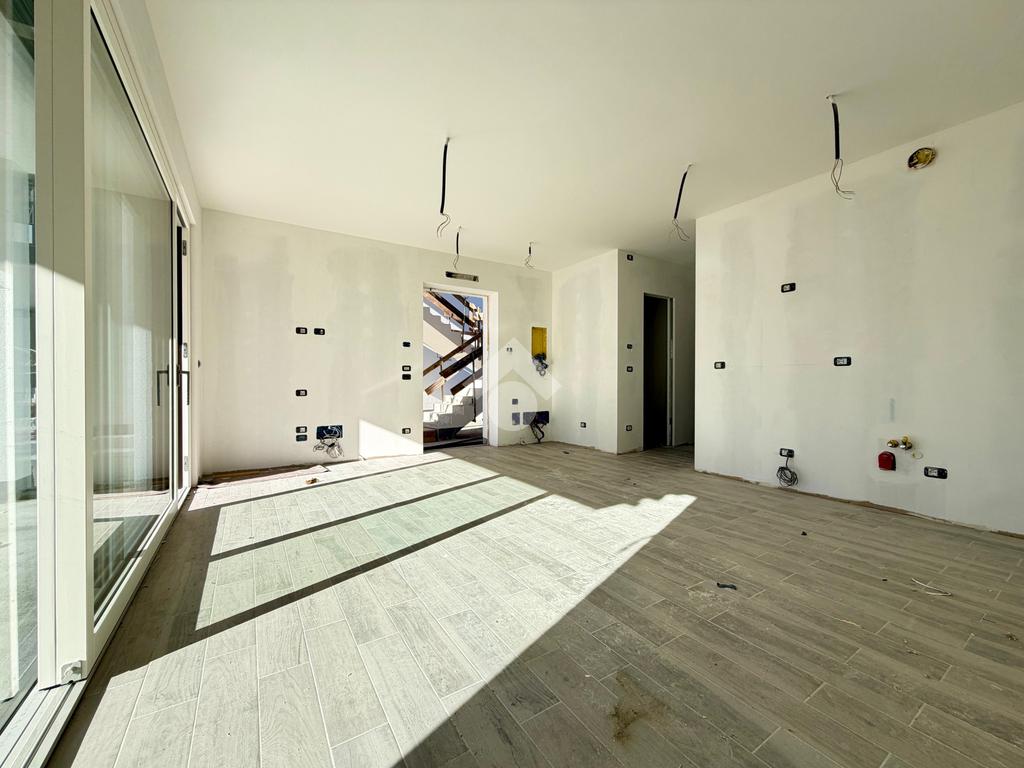 Ogni appartamento è composto da una zona giorno di quasi 32 mq con una grande porta-finestra affacciata sulla grande terrazza; sullo stesso livello si trovano una camera matrimoniale, una camera singola e due bagni. Una scala a vista conduce all’alto piano mansardato di 32 mq dove è possibile realizzare una ulteriore suite matrimoniale con eventuale bagno privato e cabina armadio. Al piano interrato, compreso nel prezzo, c’è un comodo posto auto coperto e si può acquistare un box auto chiuso.