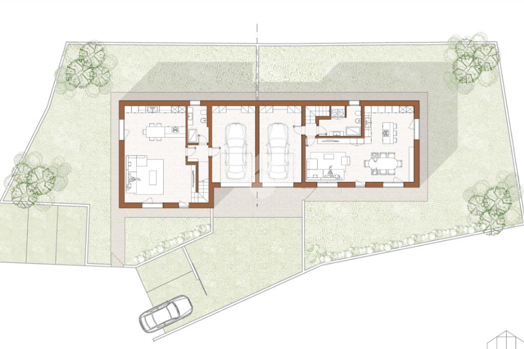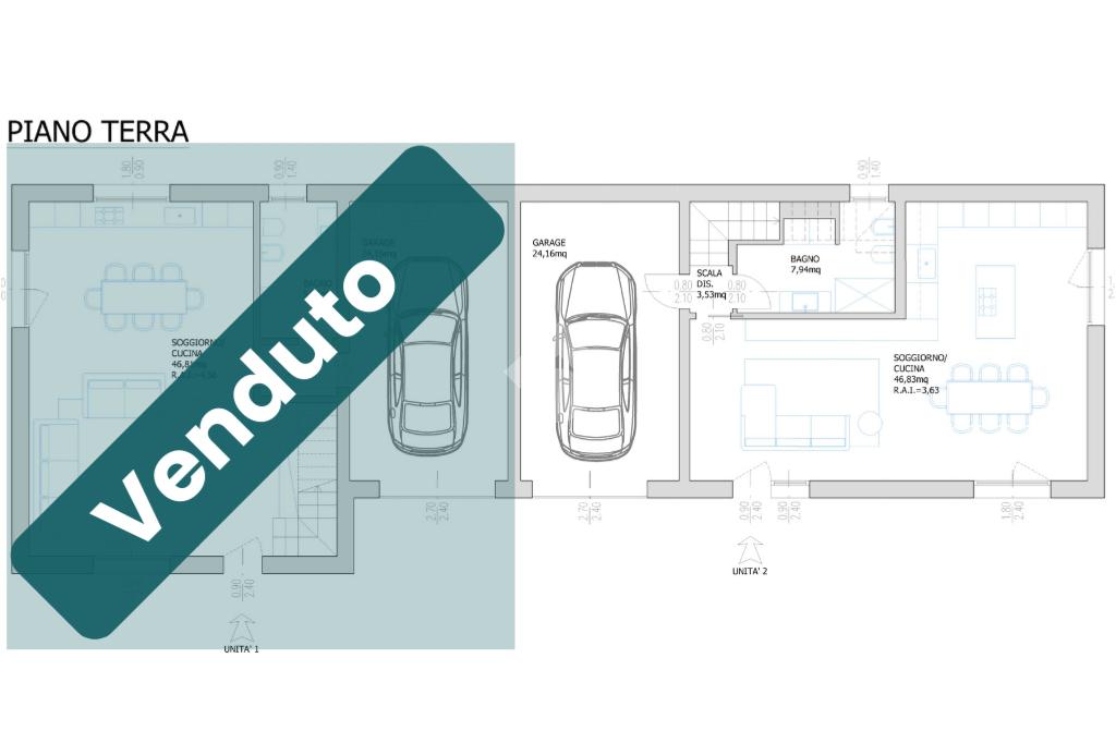 Le due porzioni hanno ingressi pedonali e carraio con grande garage e posti auto esterni di proprietà.