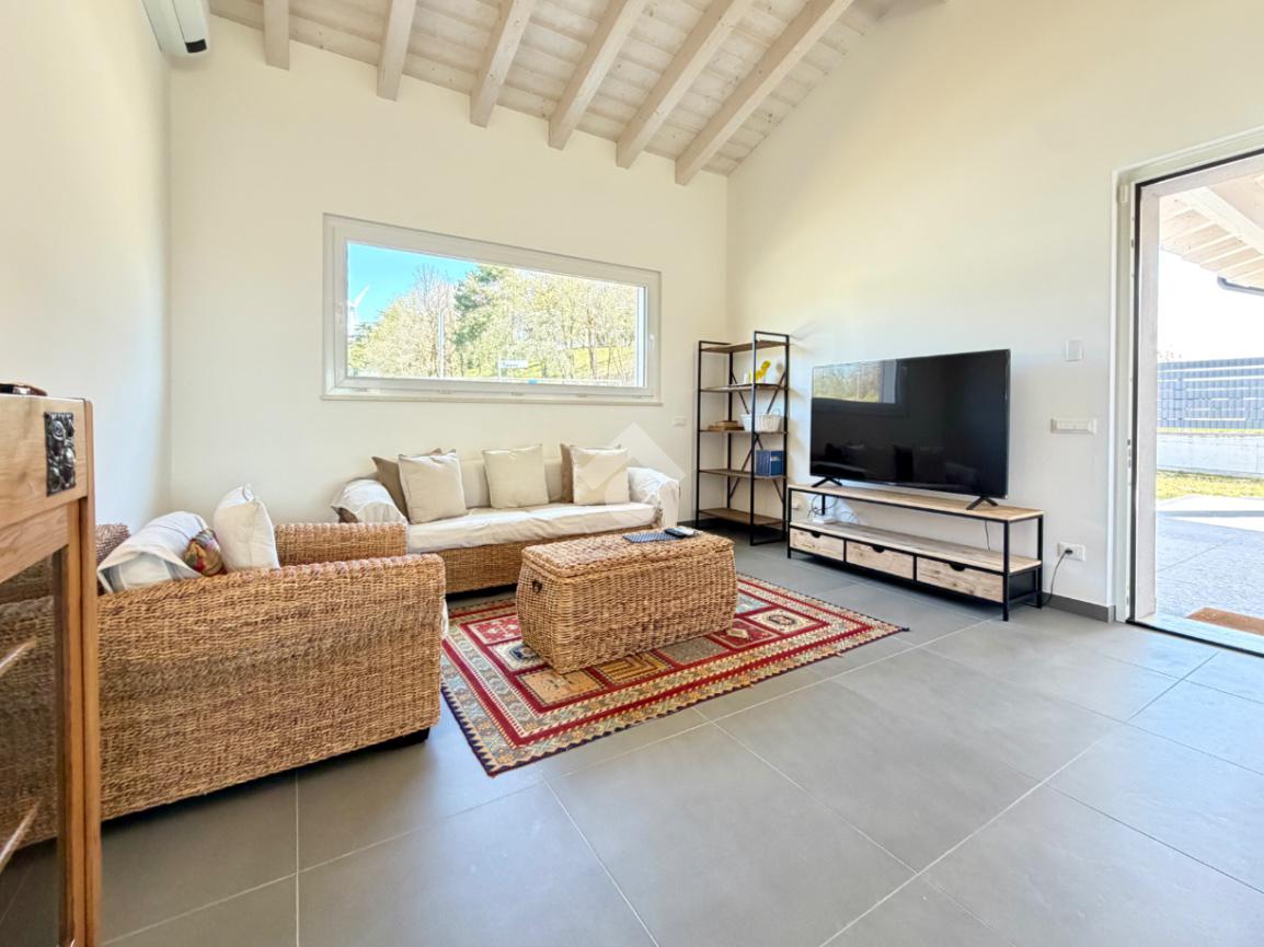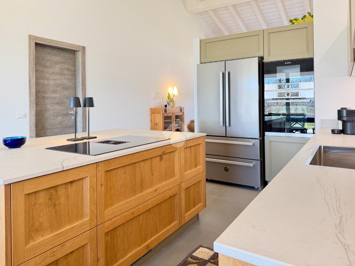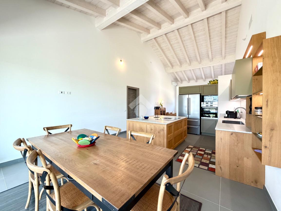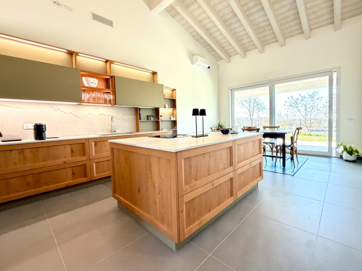 L’abitazione si distingue per l’ampia e luminosa zona giorno, caratterizzata da importanti altezze interne che raggiungono i 5 metri, elemento che dona grande respiro agli ambienti e valorizza ulteriormente la luminosità naturale anche grazie alle travi in legno sbiancate. La cucina con isola, con piano in quarzite brasiliana, si apre armoniosamente sul giardino privato e sulla terrazza esterna, pavimentata in elegante ceppo bocciardato. Le grandi vetrate scorrevoli permettono una perfetta continuità tra interno ed esterno, creando un ambiente unico ideale per vivere e ricevere in ogni stagione. La terrazza è inoltre predisposta per il riscaldamento a pavimento, offrendo la possibilità di essere chiusa e sfruttata anche nei mesi invernali.
