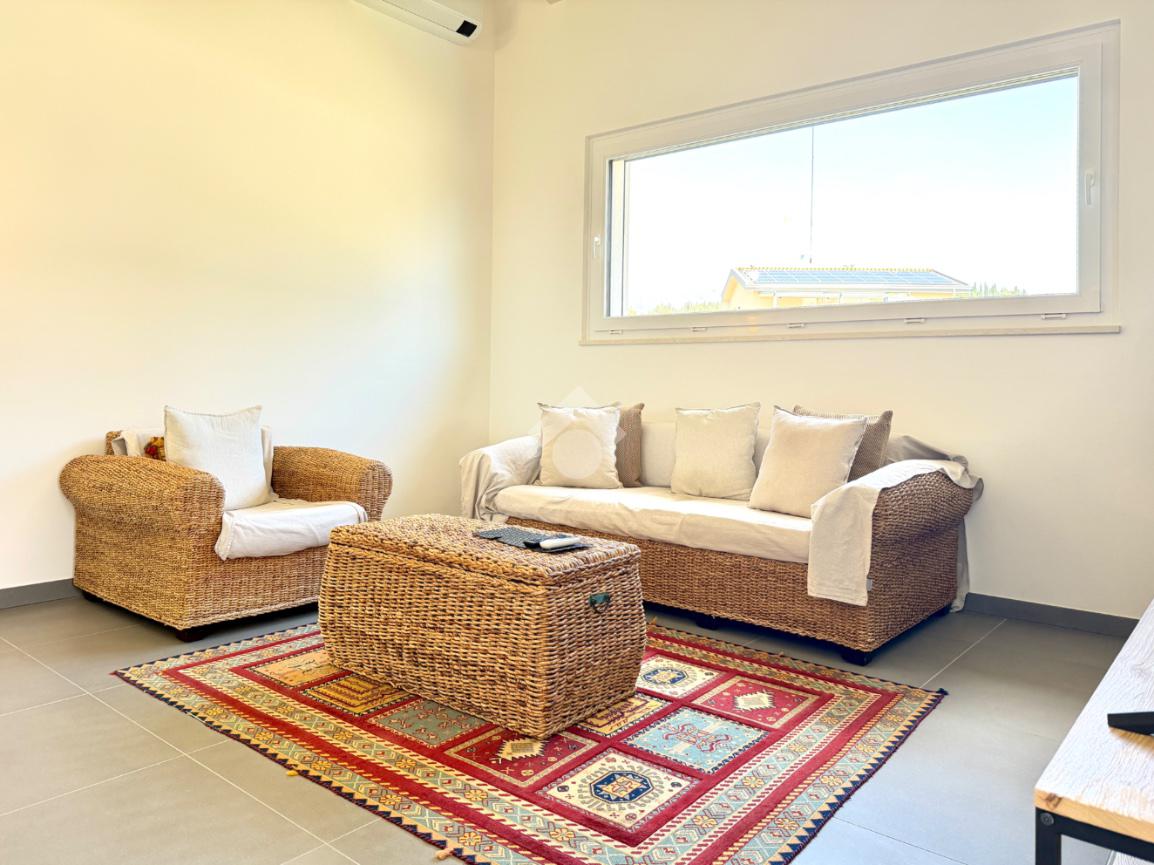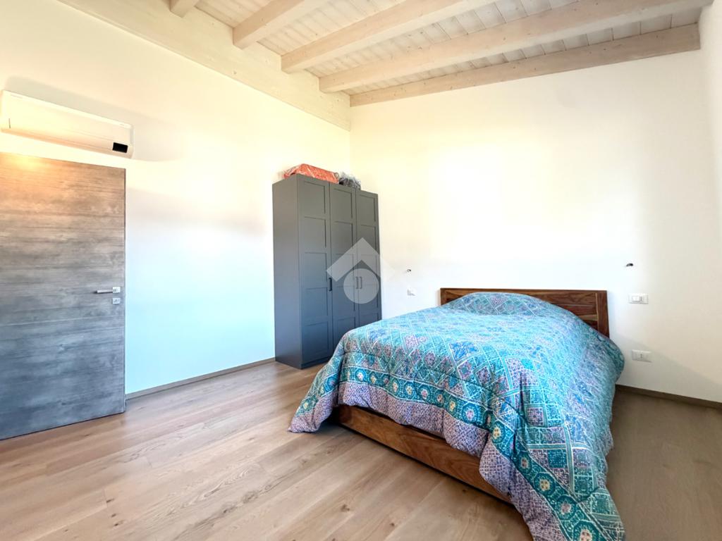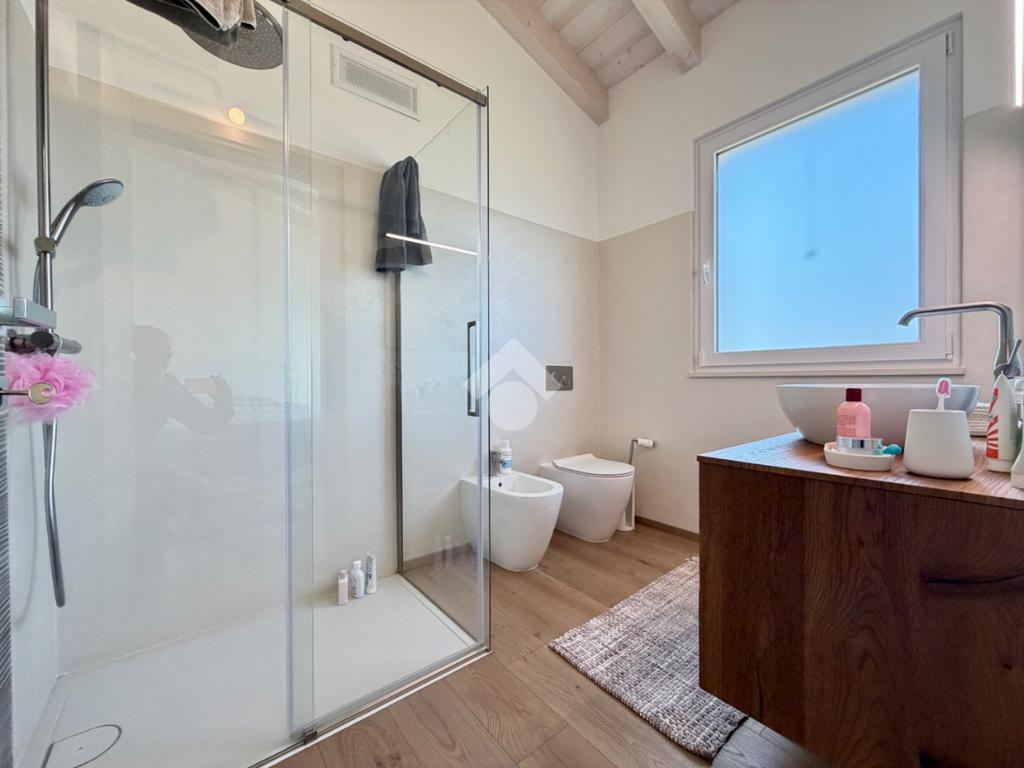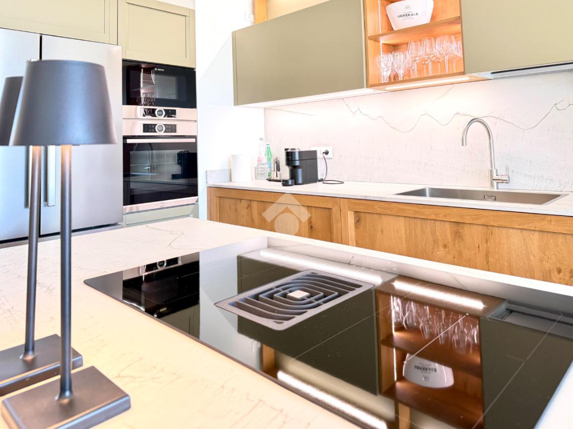 L’abitazione si distingue per l’ampia e luminosa zona giorno, caratterizzata da importanti altezze interne che raggiungono i 5 metri, elemento che dona grande respiro agli ambienti e valorizza ulteriormente la luminosità naturale anche grazie alle travi in legno sbiancate. La cucina con isola, con piano in quarzite brasiliana, si apre armoniosamente sul giardino privato e sulla terrazza esterna, pavimentata in elegante ceppo bocciardato. Le grandi vetrate scorrevoli permettono una perfetta continuità tra interno ed esterno, creando un ambiente unico ideale per vivere e ricevere in ogni stagione. La terrazza è inoltre predisposta per il riscaldamento a pavimento, offrendo la possibilità di essere chiusa e sfruttata anche nei mesi invernali.