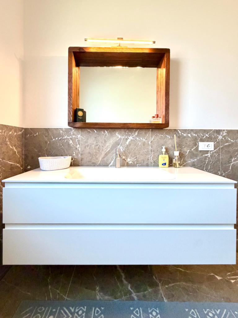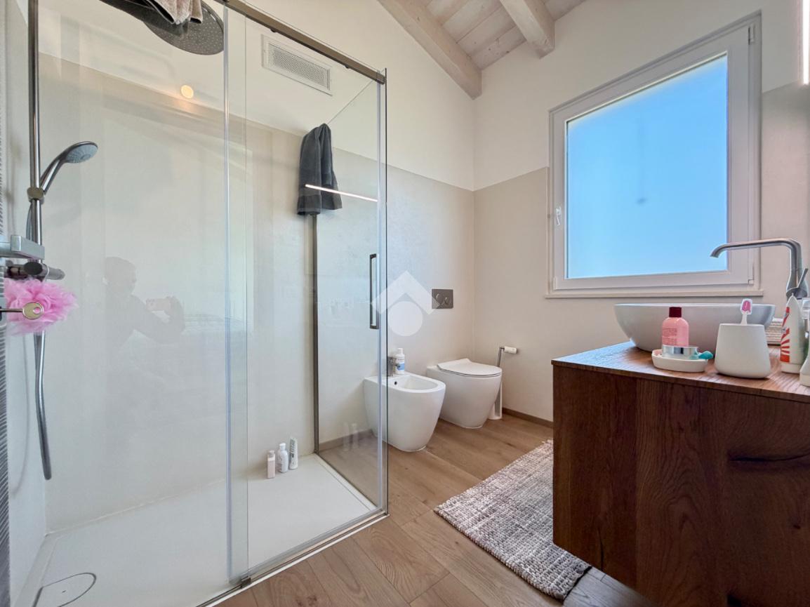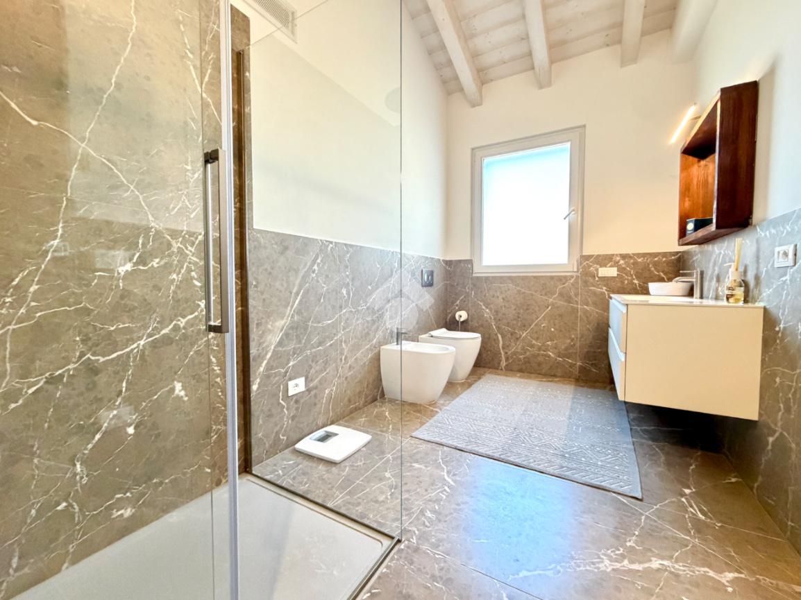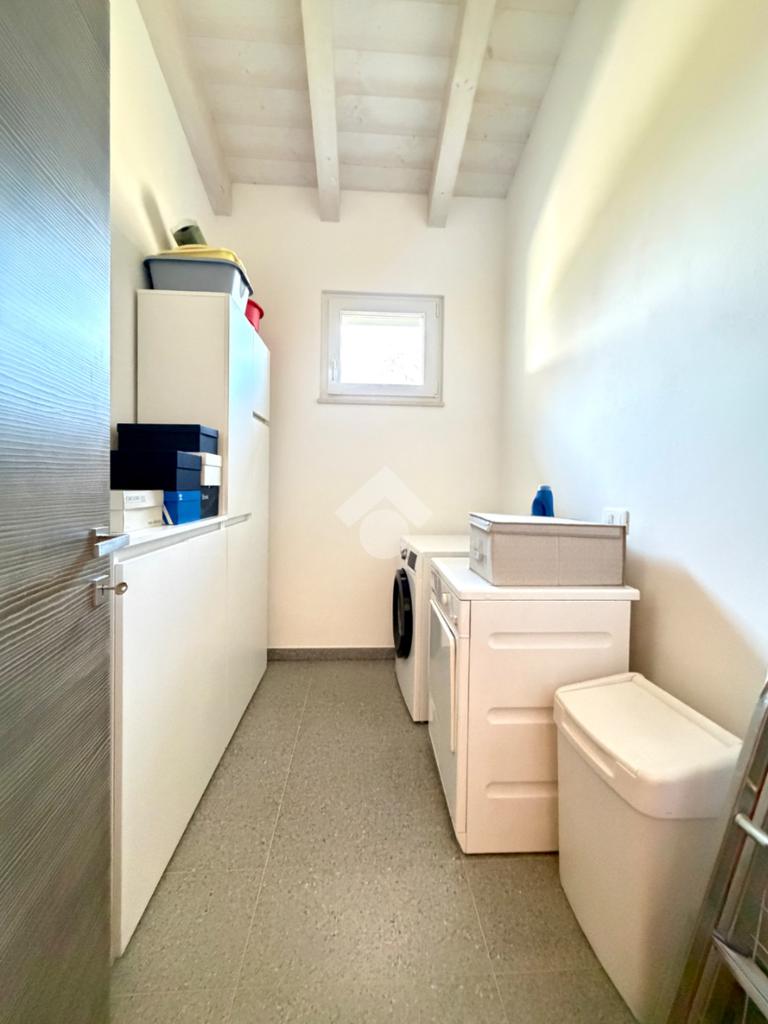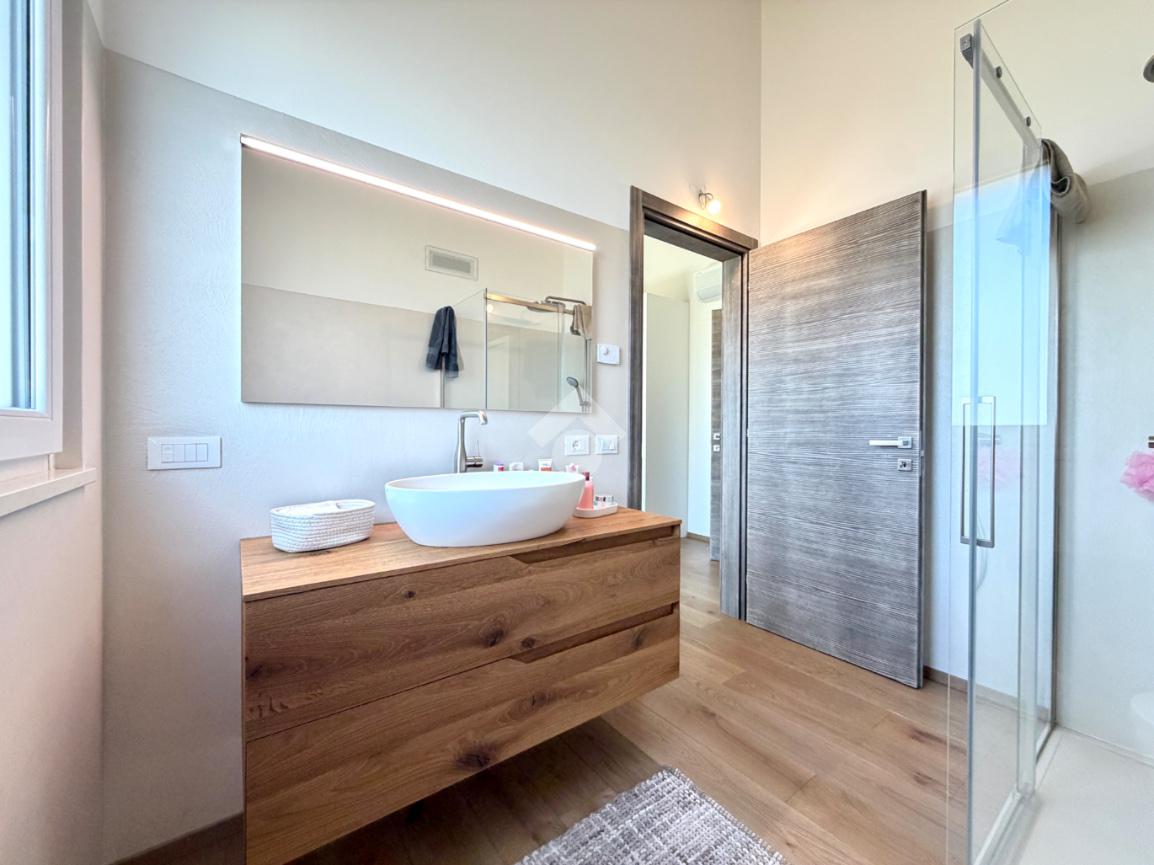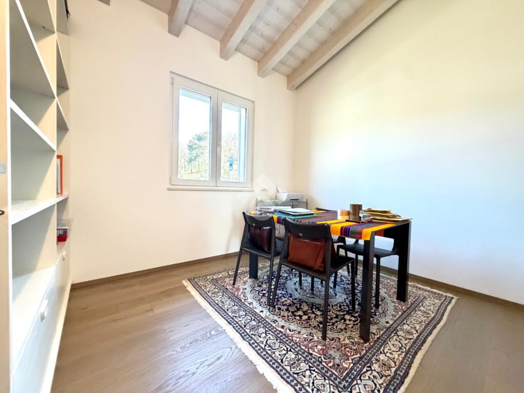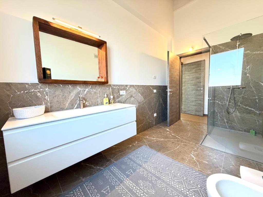La zona notte è composta da una camera padronale con bagno en suite, una camera matrimoniale e una camera doppia attualmente adibita a studio. Completano il livello un ampio bagno con doccia walk-in, rifinito in marmo fior di bosco, una comoda lavanderia, un locale tecnico e un grande garage doppio con basculante sezionale.