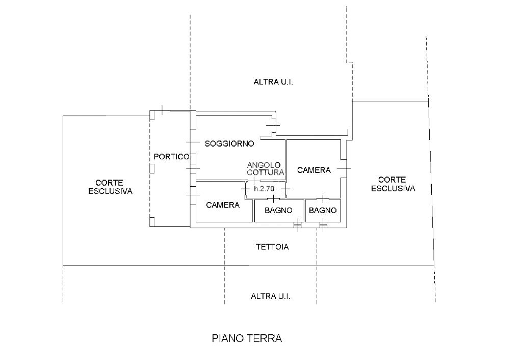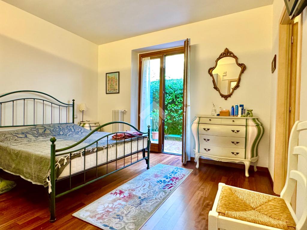 Dal vano scale (o dal giardino privato) si accede all’ appartamento direttamente nell’ampio e luminoso soggiorno con angolo cottura, un piccolo disimpegno conduce alla zona notte composta dalla camera matrimoniale con bagno privato, una camera doppia e il bagno principale. Sia il soggiorno che la camera da letto affacciano sui due porticati coperti ideali per mangiare all’esterno anche se piove e sul grande giardino privato angolare: spazio per prendere il sole in totale privacy.
