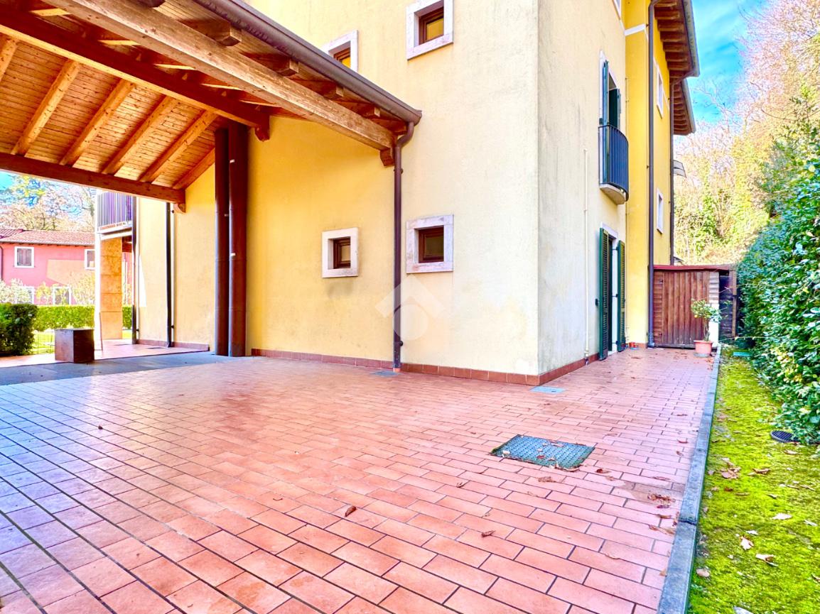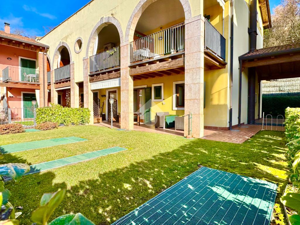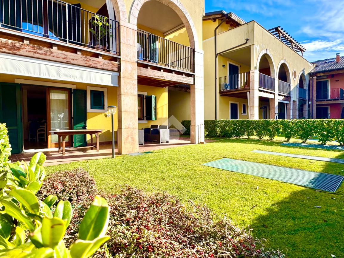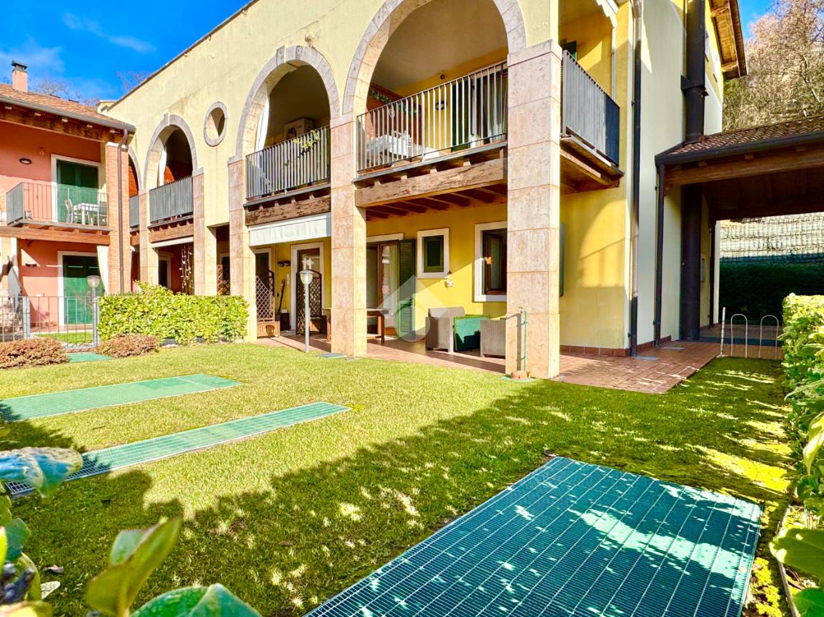 Trilocale angolare al piano terra con grande giardino e box doppio in residence con piscina