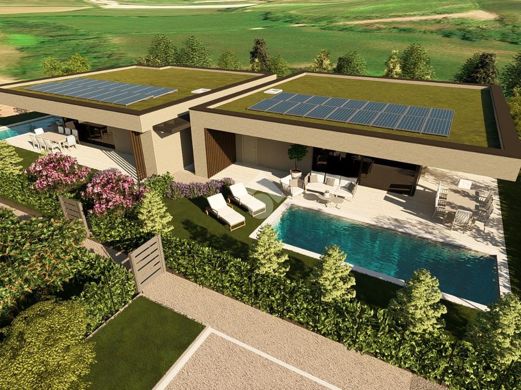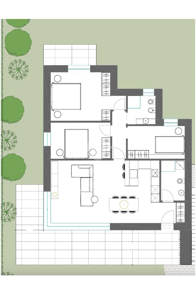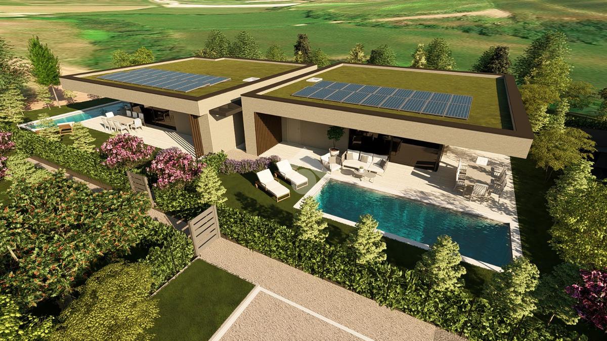 Ogni villa è dotata di un posto auto esterno privato, di un ingresso indipendente ed è composta da una grande zona giorno open-space con ampie vetrate affacciate sulla piscina e sul giardino privati, tre camere da letto e due bagni. Al piano interrato si trovano un posto auto coperto in garage e un’ampia cantina con comodo accesso anche per moto ed e-bikes.