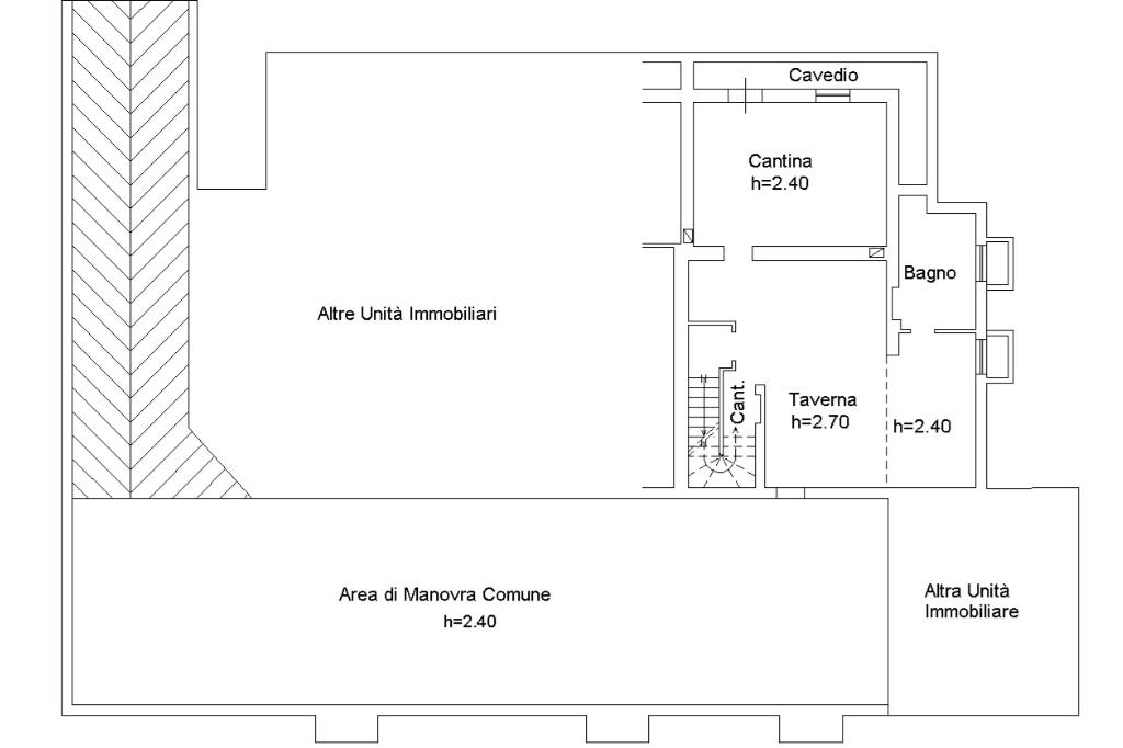 Piano Seminterrato: ampia taverna con soggiorno e angolo cottura, grande bagno e comoda cantina utilizzata come un'ulteriore camera. Dal piano si accede direttamente, tramite porta tagliafuoco, al garage doppio in larghezza di circa 40 mq.