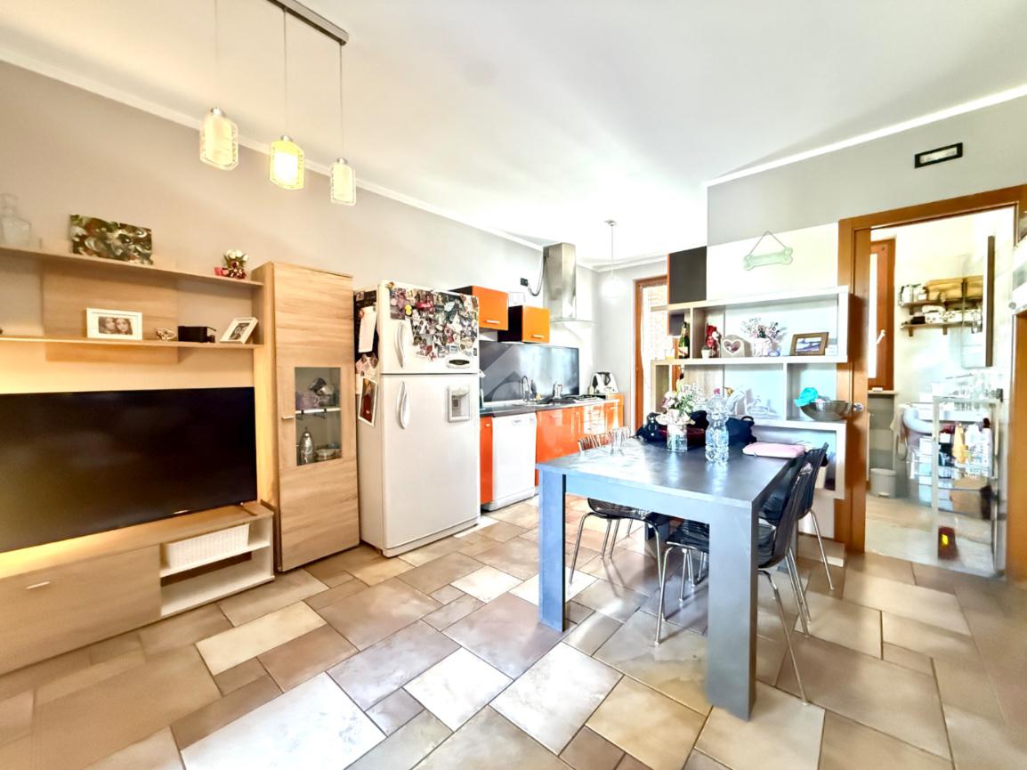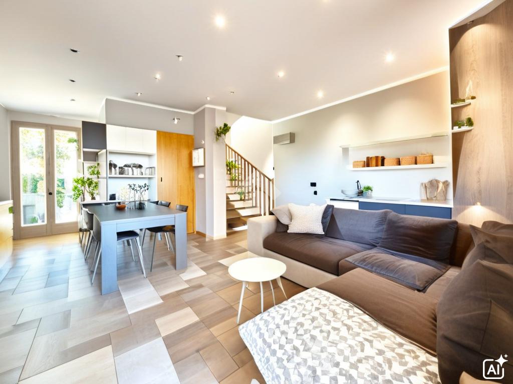 Piano Terra: luminoso soggiorno con zona living e cucina a vista, bagno di servizio e accesso diretto a una spaziosa terrazza che si apre sul giardino privato, distribuito su tre lati, ideale per momenti di relax all’aperto o convivialità.