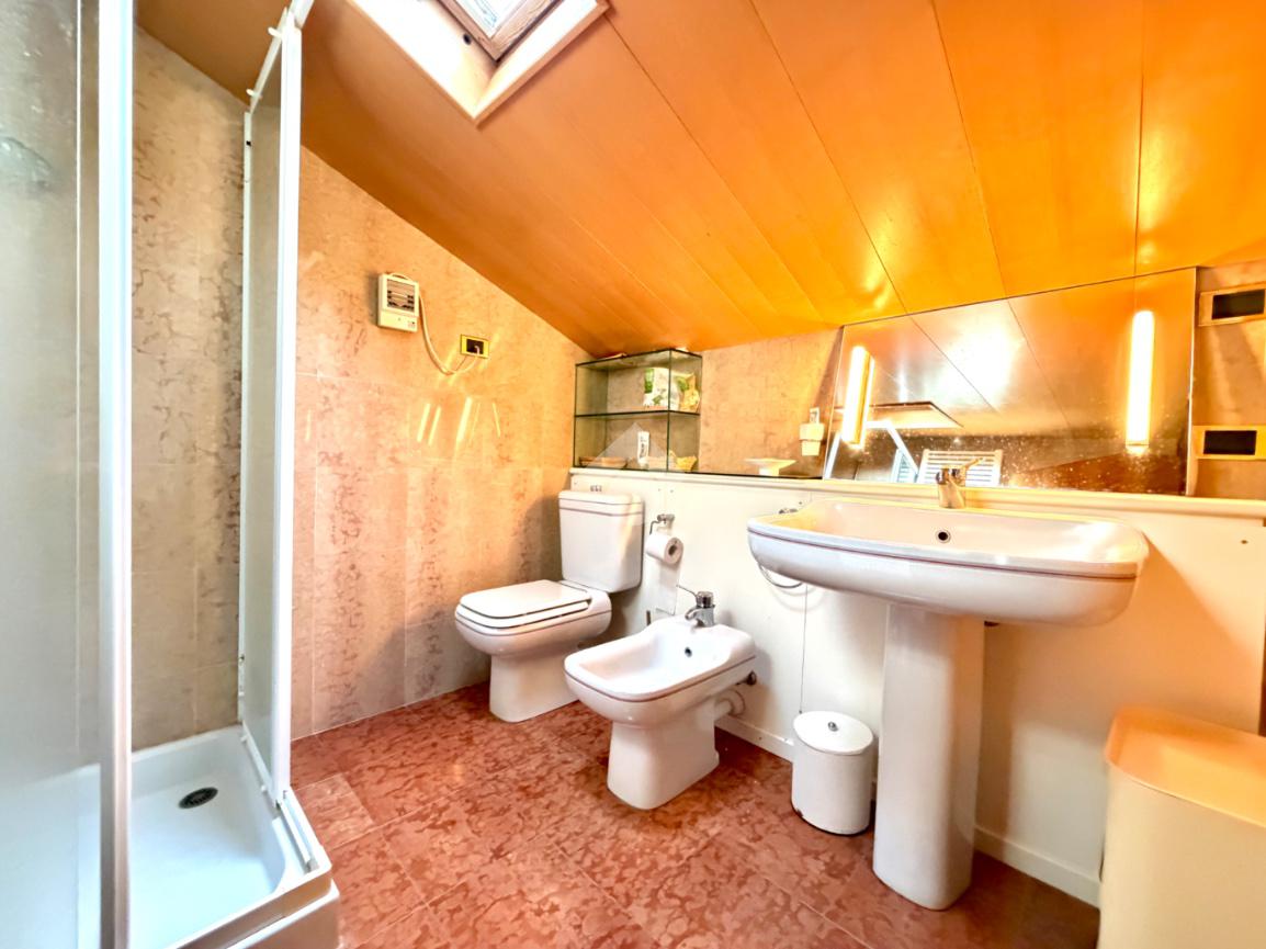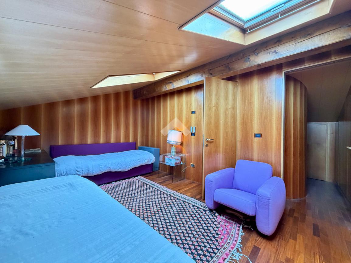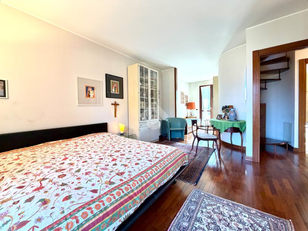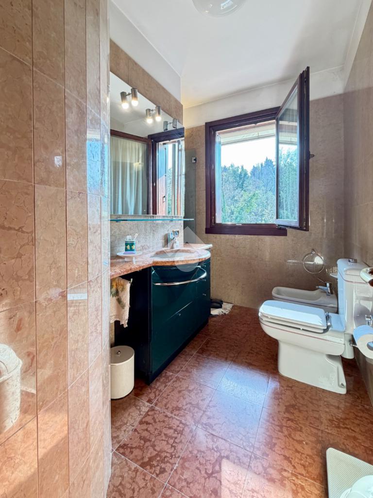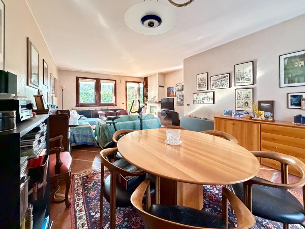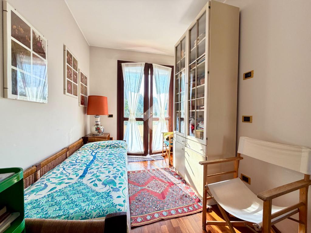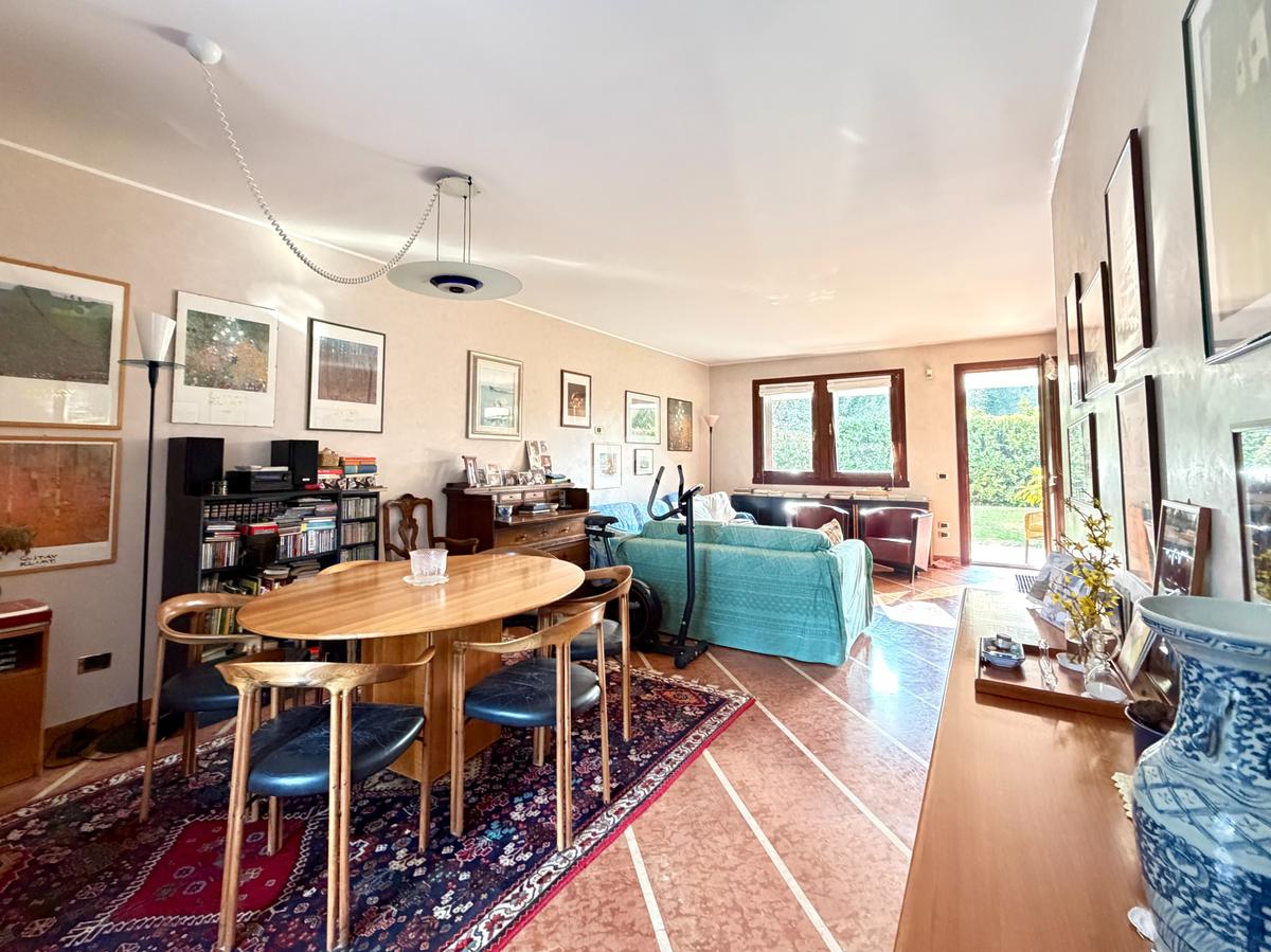 L’abitazione ci accoglie con un grande soggiorno open-space affacciato sull'ampio giardino che gode di una piacevole vista sul verde ed ospita un bellissimo camino in pietra che riscalda l’atmosfera nelle fredde giornate di mezza stagione. Al piano interrato troviamo la zona taverna, ad oggi usata come cucina, con un comodo bagno e ripostiglio. Una scala in marmo conduce al piano superiore dove si trova una spaziosa camera matrimoniale con una zona cabina armadio (un'eventuale cameretta), ed un ulteriore bagno finestrato in marmo. La mansarda è stata adibita a camera da letto, ospita due letti singoli e una pratica zona armadio a muro e due sottotetti.